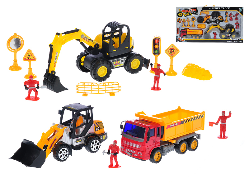 Sada stavební vozidla 20cm 3ks na setrvačník s doplňky v krabičce
