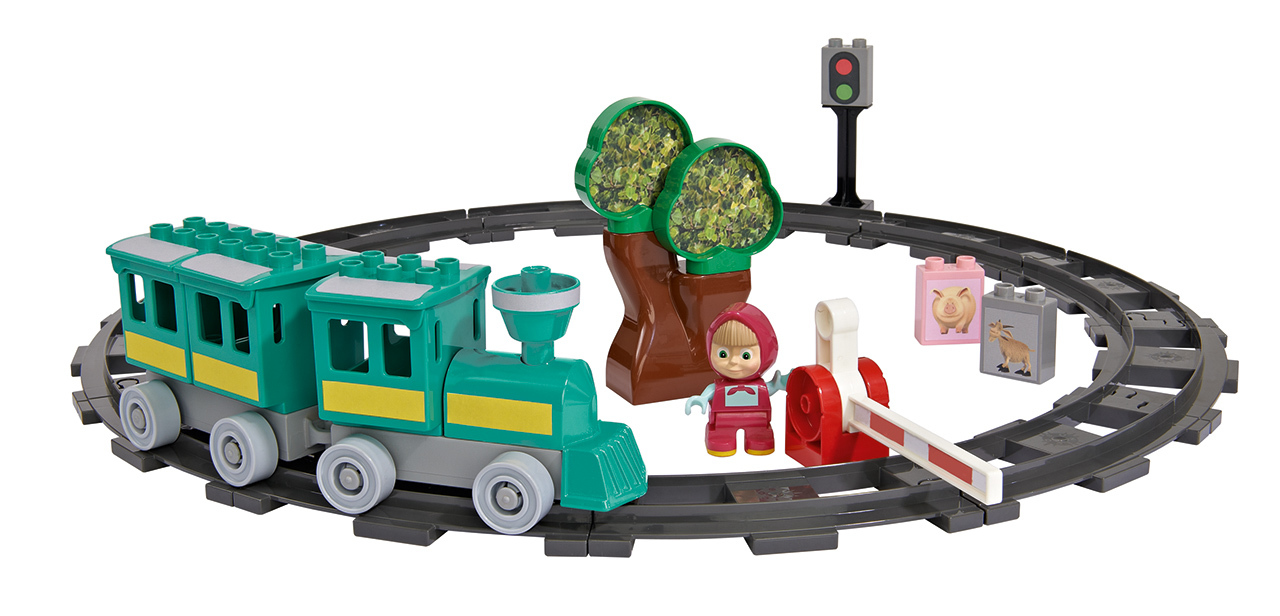 PlayBIG Bloxx vláčkodráha s mašinkou a vagónkem. Součástí figurka Máši, semafor, závora a další příslušenství. Celkem obsahuje 38 dílů. Průměr trati 57 cm. Rozměry: 57 x 13,5 x 57 cm. prečítať celé