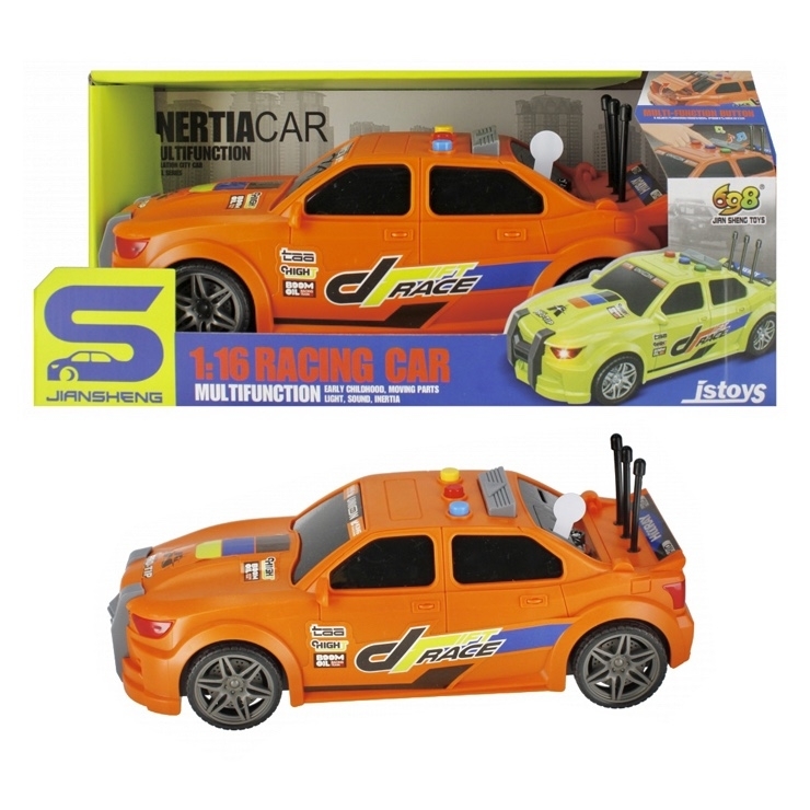 Auto má zvukové a světelné efekty, po stisku jednoho z tlačítek umístěných na střeše vozu auto vydává zvuky dunění motoru a melodii, která zpříjemňuje jízdu. Auto má tah & back funkce, takže po tlačení vozidla dopředu pokračuje v jízdě samy. Balení obsahuje závodní auto. Rozměry balení jsou 28x13x12cm. Vyžaduje 3 x AG13LR44 baterie - součástí balení. Hračka je určena pro děti ve věku 3+.