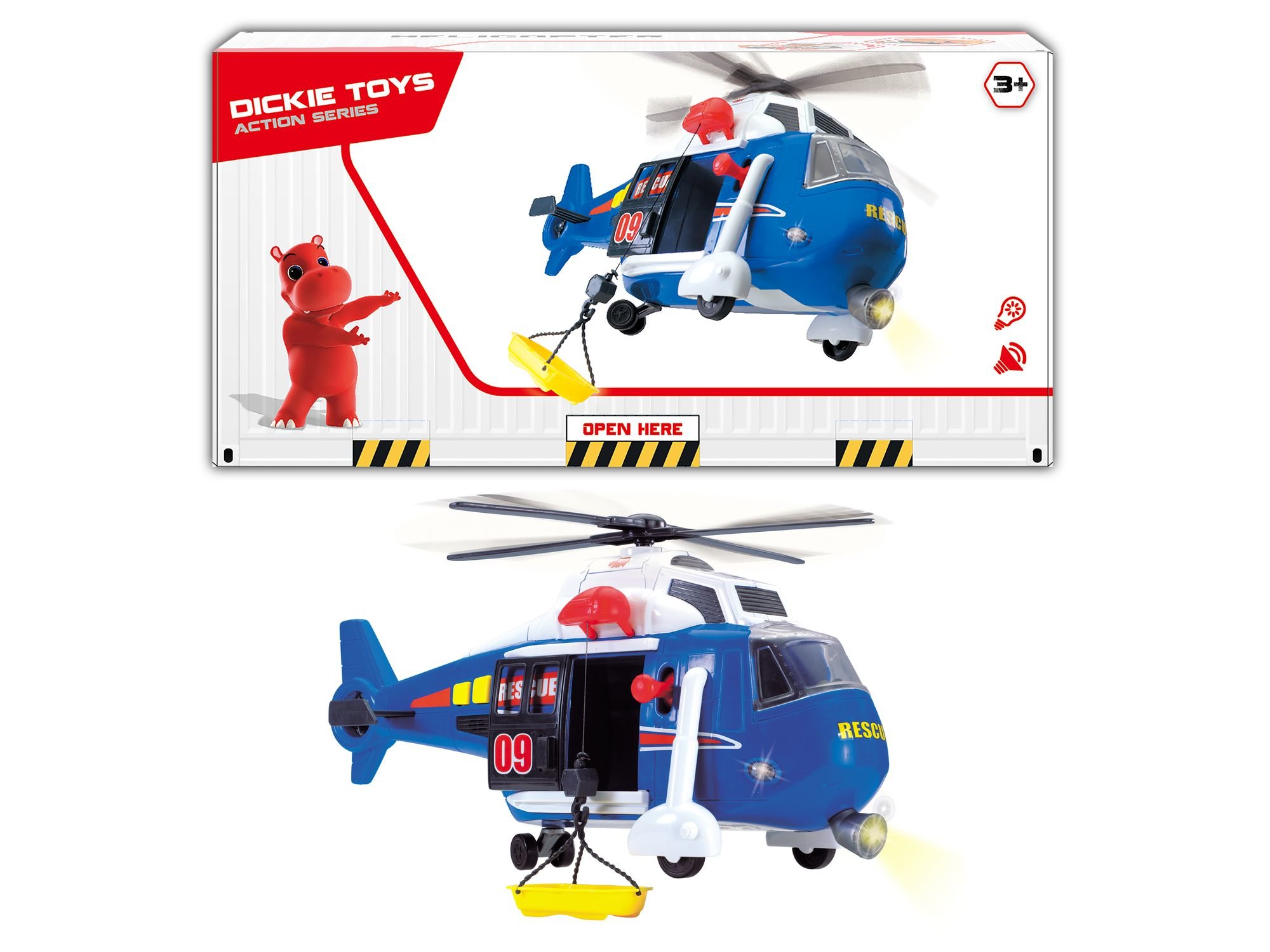 Záchranářský vrtulník se zvukovými a světelnými efekty. Vrtule se točí, lehátko se ovládá tlačítkem (nahoru/dolů). Nechybí otevírací dveře. Velikost 41 cm. prečítať celé