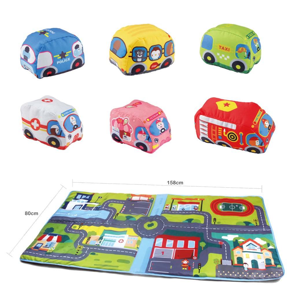 Kobereček na hraní Bayo je nádherný kobereček s motivem města s nádherně vykreslenými cestami, semafory,kruhovým objezdem a budovami. Kobereček doplňuje 6 měkých polštářkových autíček - požárníci policie, autobus, .... Je vhodný pro děti od 12 měsíců. Kobereček chrání od chladné podlahy a má rozměry 80x158 cm.