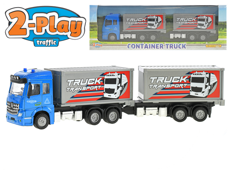 Přepravní auto o velikosti 29cm s přívěsem okouzlí každého malého chlapce. Auto má modrou barvu a na přívěsu má naloženy 2 kontejnery. Tento kovový set je součástí kolekce 2-Play. prečítať celé