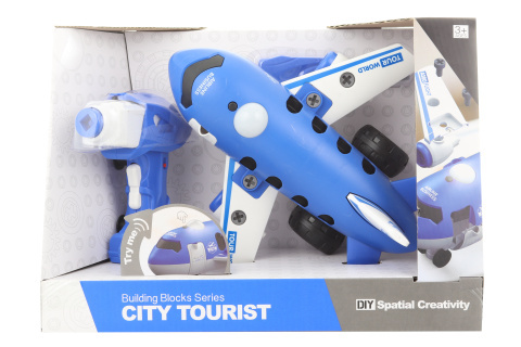 Šroubovací letadlo na dálkové ovládání. Letadlo lze sešroubovat pomocí přiloženého šroubováku nebo vrtačky. Z vrtačky lze vyndat motorek, který se vloží do letadla a to poté jezdí pomocí ovládání dopředu a dozadu. Letadlo také vydává zvuky. Napájení na 4 AA baterie (nejsou součástí) a na 3 AG13 baterie (jsou součástí). Rozměry letadla cca 26 x 25 x 14 cm. Rozměry balení cca 34 x 24 x 16 cm. Věk 3+