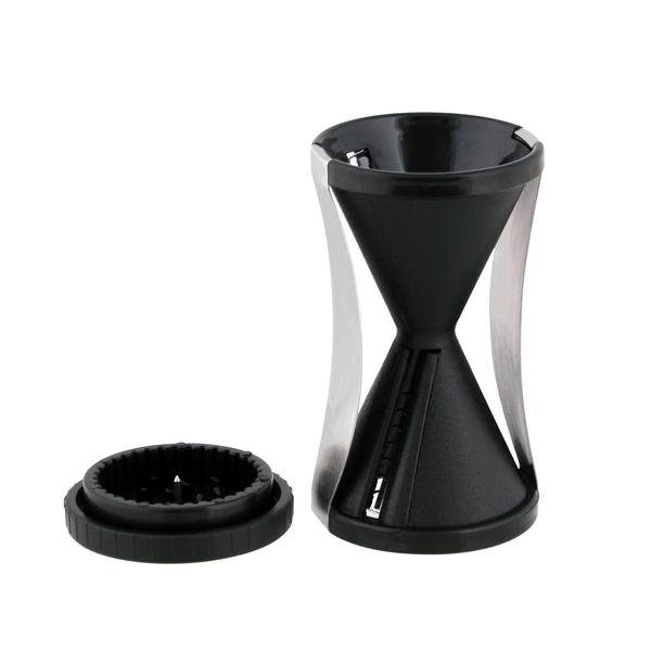 Spirálový kráječ na zeleninu. S tímto dekorativním kráječem vykouzlíte během chvíle dlouhé nudličky a spirálky z mrkve, okurek, ředkviček a jiné tvrdší zeleniny. Kráječ má z každé strany rozdílnou tloušťku požadovaného krájení. Navíc je vybaven otáčecím držákem, na který jednoduše nabodnete zeleninu a nehrozí poranění prstů. Materiál - plast, nerez. Rozměry - 6,8 x 13 cm. Barva černá.