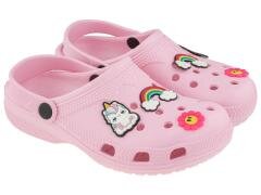 Urocze clogi dziewczęce w kolorze różowym to idealne obuwie na lato - sprawdzą się zarówno w domu, jak i na zewnątrz, np. w ogrodzie, na plaży czy podczas wakacyjnych wyjazdów. Model został ozdobiony gumowymi pinami w kształcie jednorożca, tęczy i kwiatka - po trzy na każdego cloga. Piny można...