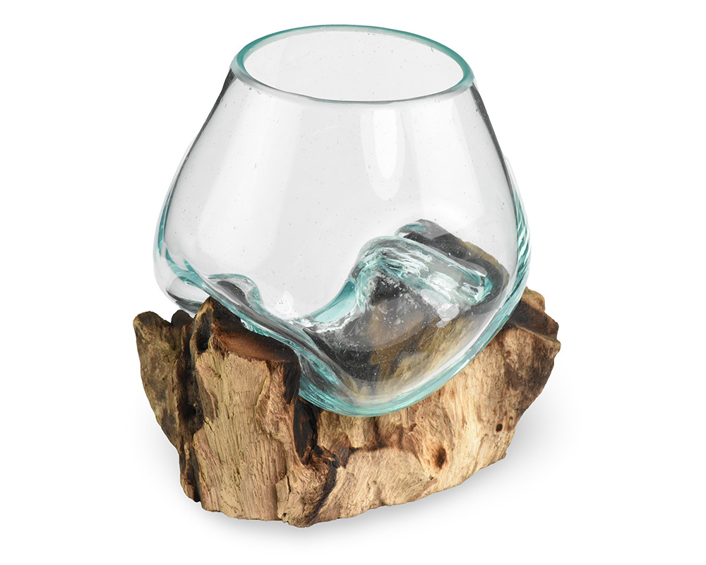 Tato skleněná nádoba spojuje tavené sklo a přírodní dřevo v praktický a estetický doplněk do interiéru. Sklo je ručně tvarované tak, aby přesně zapadlo na dřevěný podklad, což vytváří příjemný kontrast mezi chladným sklem a teplým dřevem. Každý kus je originální díky přirozené struktuře dřeva a...