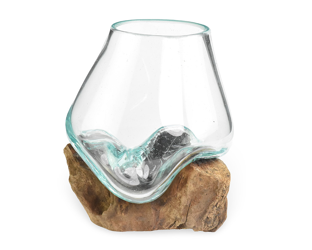 Tato skleněná nádoba spojuje tavené sklo a přírodní dřevo v praktický a estetický doplněk do interiéru. Sklo je ručně tvarované tak, aby přesně zapadlo na dřevěný podklad, což vytváří příjemný kontrast mezi chladným sklem a teplým dřevem. Každý kus je originální díky přirozené struktuře dřeva a...