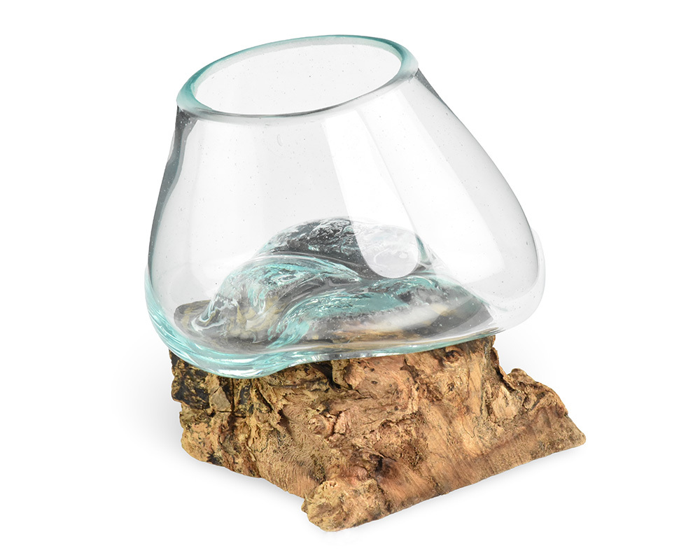 Tato skleněná nádoba spojuje tavené sklo a přírodní dřevo v praktický a estetický doplněk do interiéru. Sklo je ručně tvarované tak, aby přesně zapadlo na dřevěný podklad, což vytváří příjemný kontrast mezi chladným sklem a teplým dřevem. Každý kus je originální díky přirozené struktuře dřeva a...