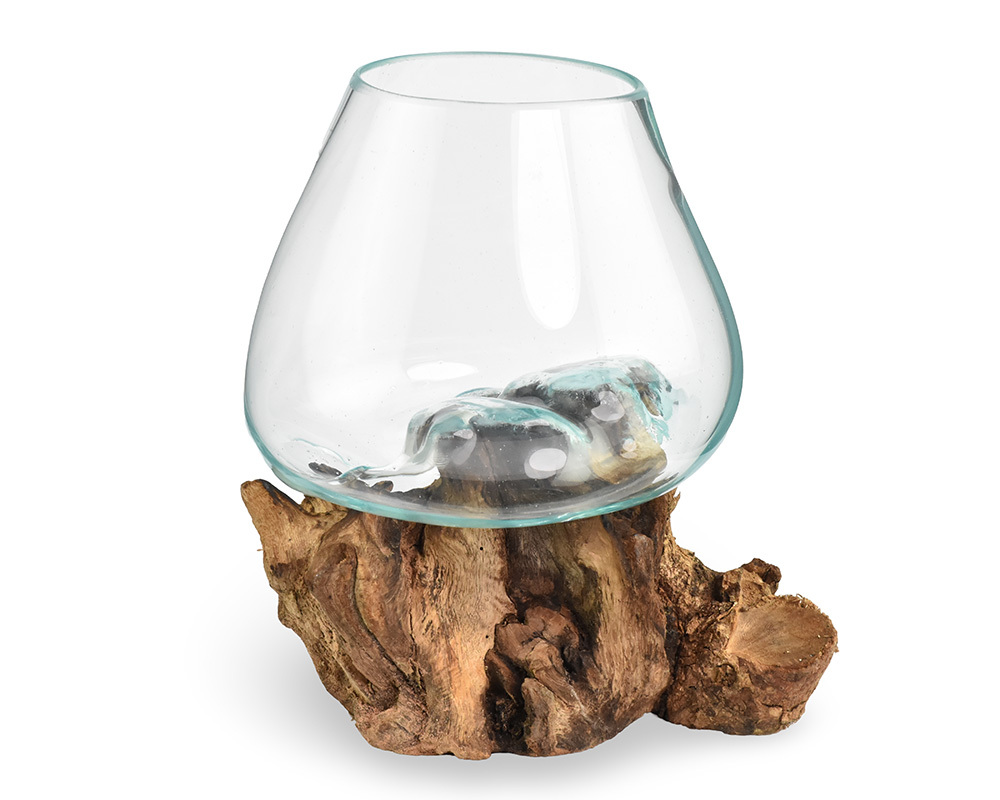 Tato skleněná nádoba spojuje tavené sklo a přírodní dřevo v praktický a estetický doplněk do interiéru. Sklo je ručně tvarované tak, aby přesně zapadlo na dřevěný podklad, což vytváří příjemný kontrast mezi chladným sklem a teplým dřevem. Každý kus je originální díky přirozené struktuře dřeva a...
