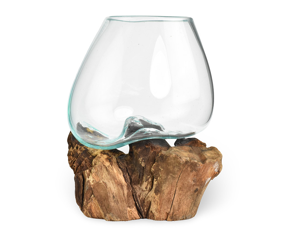 Tato skleněná nádoba spojuje tavené sklo a přírodní dřevo v praktický a estetický doplněk do interiéru. Sklo je ručně tvarované tak, aby přesně zapadlo na dřevěný podklad, což vytváří příjemný kontrast mezi chladným sklem a teplým dřevem. Každý kus je originální díky přirozené struktuře dřeva a...
