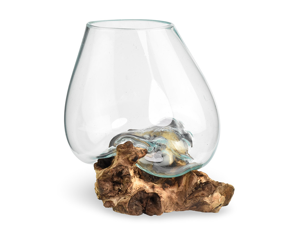 Tato skleněná nádoba spojuje tavené sklo a přírodní dřevo v praktický a estetický doplněk do interiéru. Sklo je ručně tvarované tak, aby přesně zapadlo na dřevěný podklad, což vytváří příjemný kontrast mezi chladným sklem a teplým dřevem. Každý kus je originální díky přirozené struktuře dřeva a...
