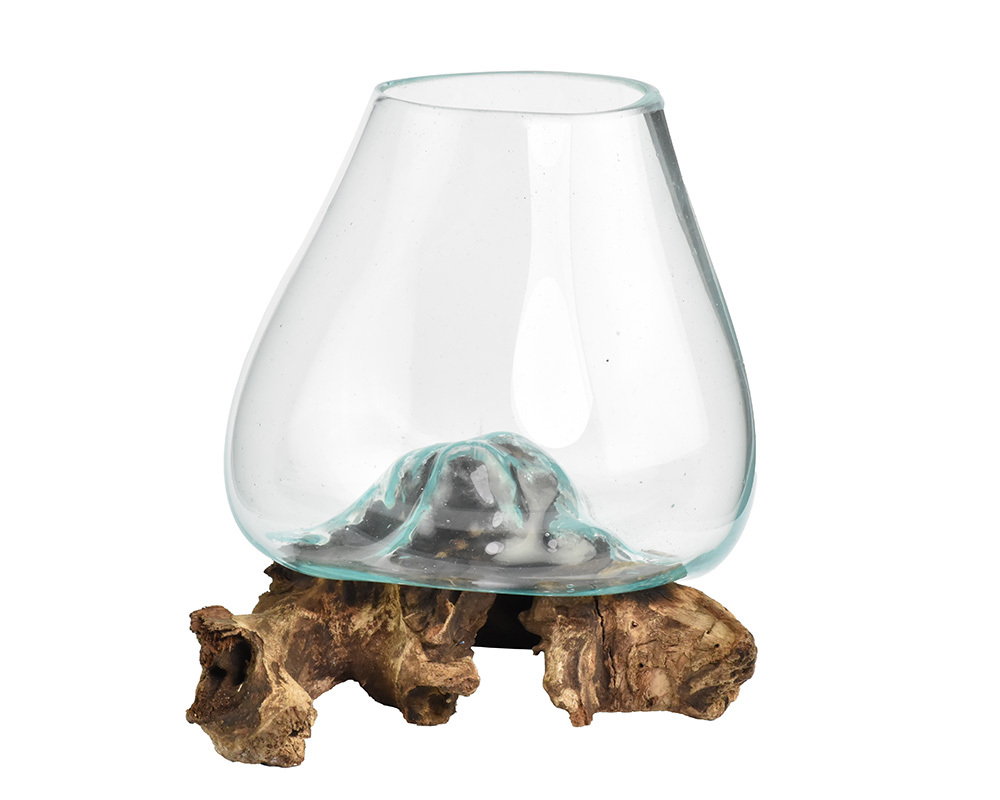 Tato skleněná nádoba spojuje tavené sklo a přírodní dřevo v praktický a estetický doplněk do interiéru. Sklo je ručně tvarované tak, aby přesně zapadlo na dřevěný podklad, což vytváří příjemný kontrast mezi chladným sklem a teplým dřevem. Každý kus je originální díky přirozené struktuře dřeva a...