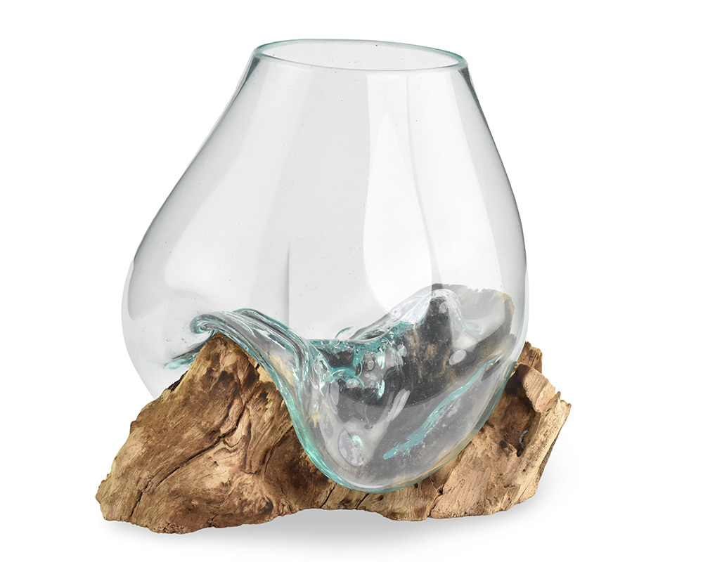 Tato skleněná nádoba spojuje tavené sklo a přírodní dřevo v praktický a estetický doplněk do interiéru. Sklo je ručně tvarované tak, aby přesně zapadlo na dřevěný podklad, což vytváří příjemný kontrast mezi chladným sklem a teplým dřevem. Každý kus je originální díky přirozené struktuře dřeva a...