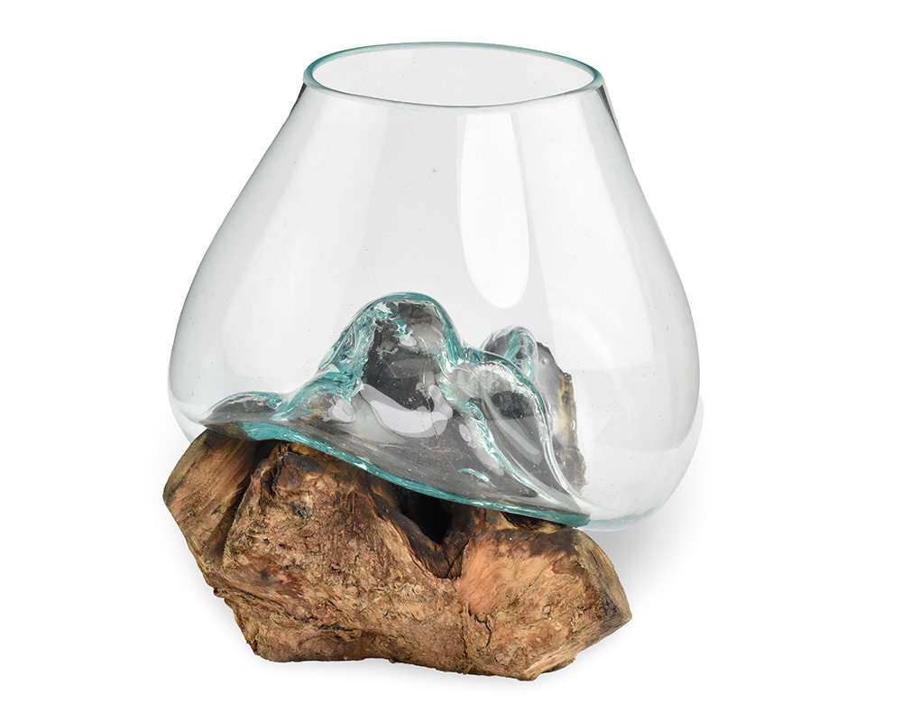 Tato skleněná nádoba spojuje tavené sklo a přírodní dřevo v praktický a estetický doplněk do interiéru. Sklo je ručně tvarované tak, aby přesně zapadlo na dřevěný podklad, což vytváří příjemný kontrast mezi chladným sklem a teplým dřevem. Každý kus je originální díky přirozené struktuře dřeva a...