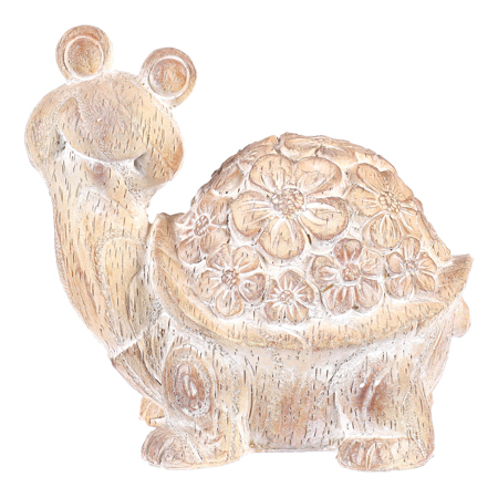 Roztomilá figurka želvy z polyresinu, která je zdobena květinovým vzorem, přináší do vašeho venkovního prostoru příjemné oživení. Realistická imitace dřeva s krásnou strukturou a viditelnými letokruhy dodává této dekoraci na autentičnosti, což dokonale ladí se zahradním prostředím. Zkrášlete svá zákoutí touto kouzelnou figurkou, která zaujme nejen vás, ale i všechny vaše návštěvníky.