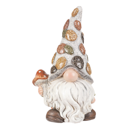 Tato dekorační figurka představuje roztomilého skřítka vyrobeného z magneziové keramiky. Jeho bílé vousy a špičatá šedá čepice imitující kámen s ozdobnými barevnými oblázky dodávají postavičce jedinečný a hravý vzhled. V ruce drží mochomůrku, jako by se zrovna chtěl pochlubit svým úlovkem....