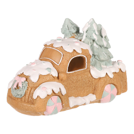 Dekorace z perníku patří k nejtypičtějším a nejkrásnějším ozdobám využívaným pro vánoční čas. Toto nádherně zdobené perníková autíčko z polyresinu, doplněné LED osvětlením uvnitř, bude skvělou volbou pro ozdobení poliček, stolů a dalších viditelných míst. Vypadá jako cukrářské mistrovské dílo, které umožňuje vytvořit neodolatelný světelný efekt díky pronikajícím paprskům světla skrze okénka ven.