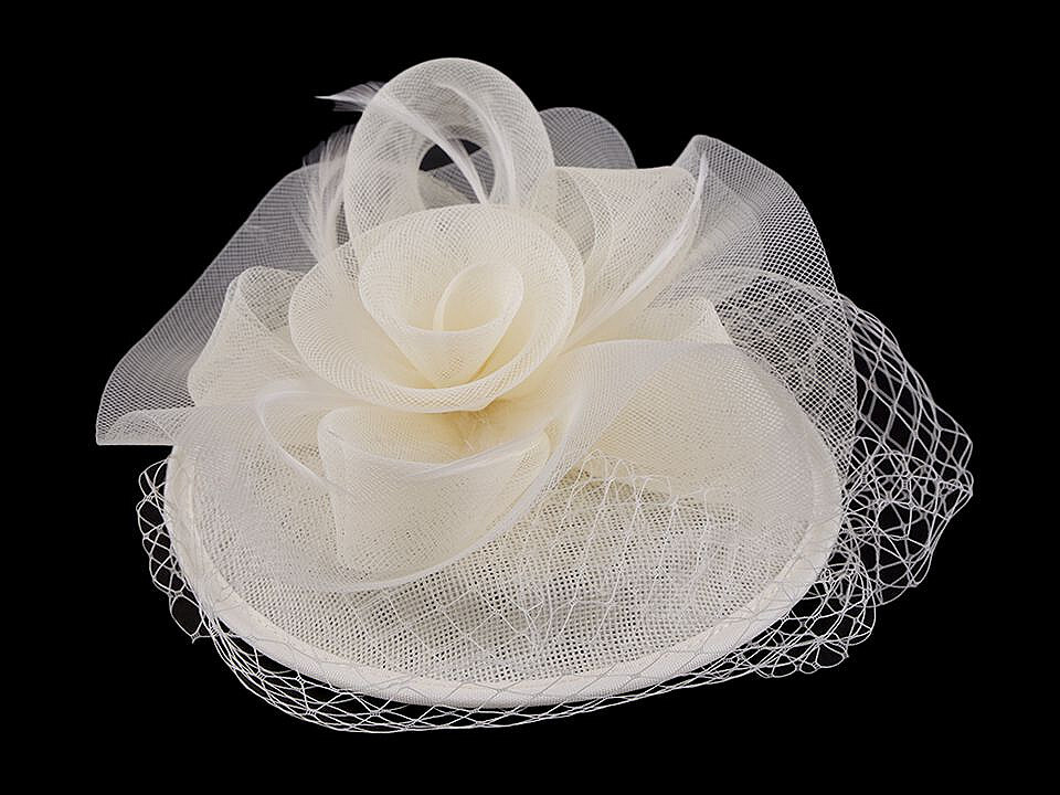 Fascinátor / klobouček květ s peřím a francouzským závojem - 1 ks - 1 krémová světlá