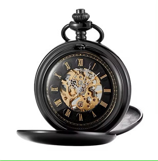 Natahovací kapesní otevírací hodinky z kovu se zlatou povrchovou úpravouHodinky mají lesklou povrchovou úpravuŘetízek hodinek je součástí dodávky, pouzdro je celokovové, hodinový strojek mechanický - na naruční natahovánípovrchová úpravačernározměr hodinek47 mmmateriál pouzdraobecný kovpohon...