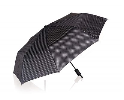 Deštník skládací 52 cm v černé barvě s puntíky, slouží k ochraně proti dešti a přímému slunci. Je vyroben z nepromokavého materiálu polyester. Má ochranu proti poškození větrem, automatické otevíraní a je skládací pro snadné uskladnění. prečítať celé
