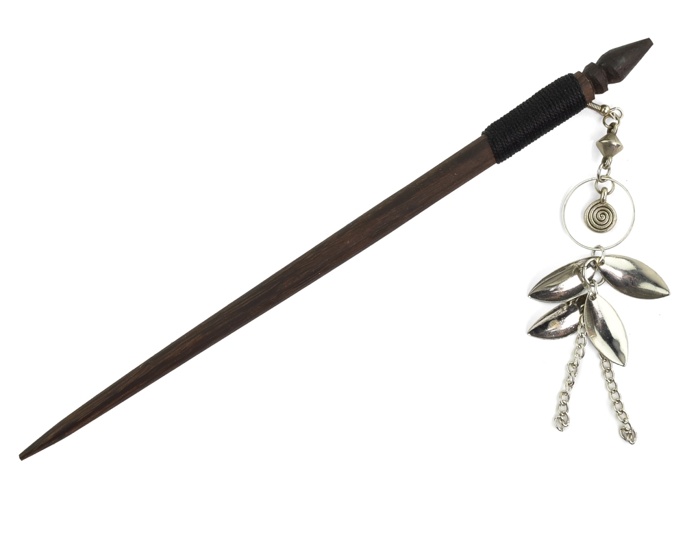 Jehlice do vlasů 18,5 cm, dřevo, velká kovová ozdoba O - Spirála, lístky, korálek kov