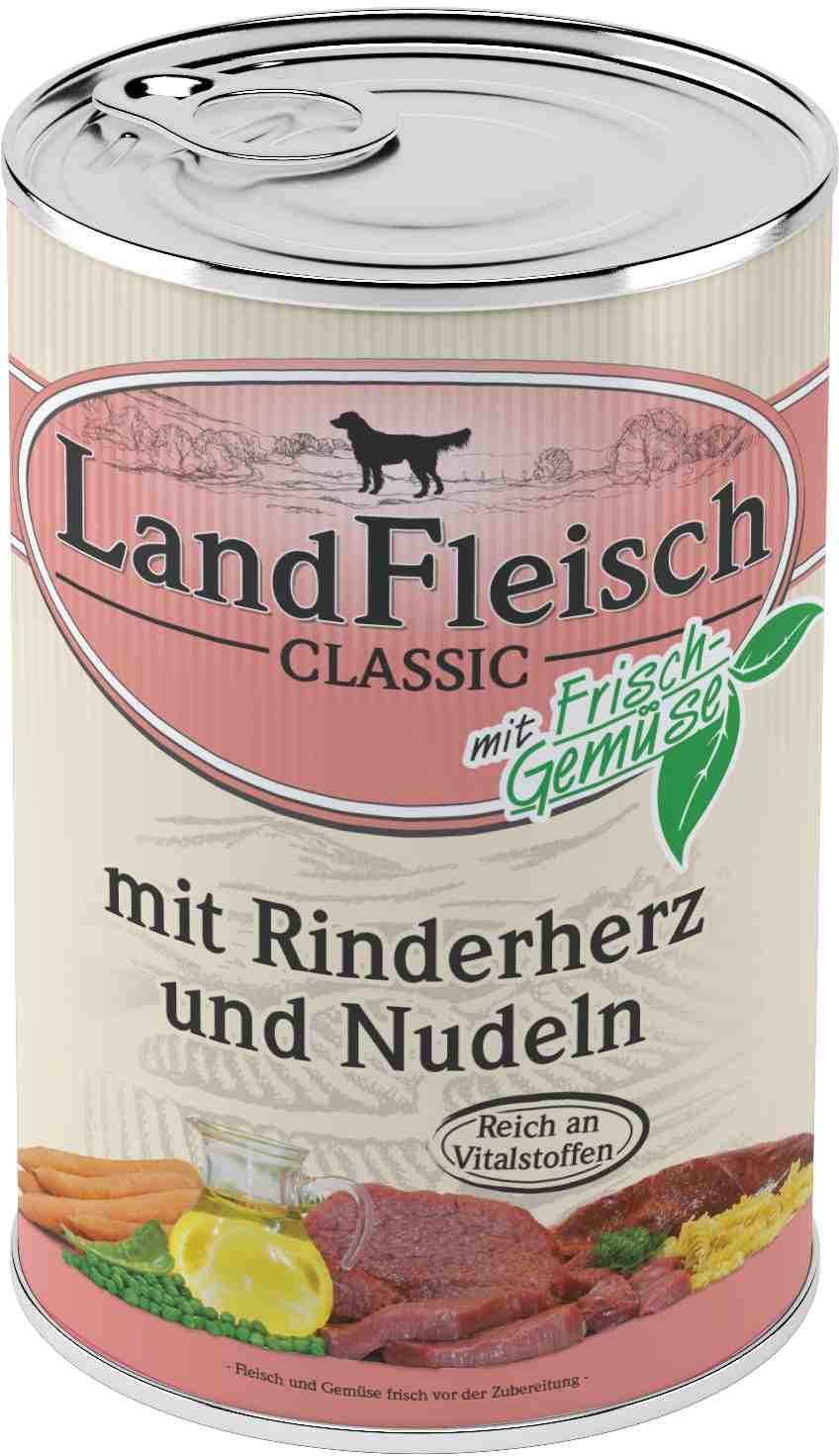 Konzerva Landfleisch hovězí srdce, těstoviny a zelenina. Kompletní krmivo pro dospělé psy všech plemen. Landfleisch konzervy jsou exkluzivně vyráběny z čerstvého masa a čerstvé zeleniny. Všechny suroviny pocházejí z přírody z německých farem. Obsahuje pouze čerstvé maso z jatečných zvířat...