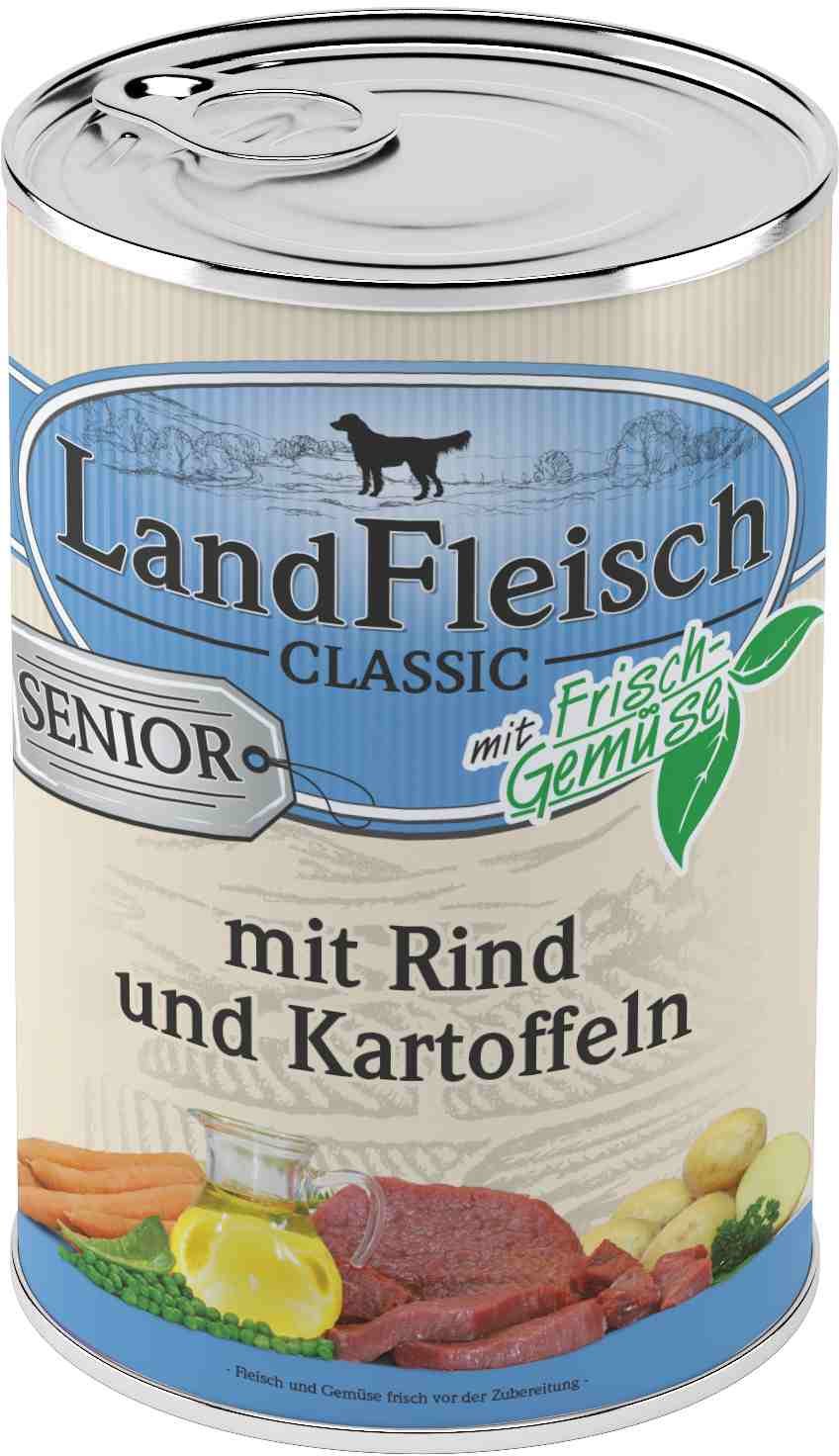 Konzerva Landfleisch s hovězím, brambory a zeleninou. Kompletní krmivo pro starší psy všech plemen. Landfleisch konzervy jsou exkluzivně vyráběny z čerstvého masa a čerstvé zeleniny. Všechny suroviny pocházejí z přírody z německých farem. Obsahuje pouze čerstvé maso z jatečných zvířat...
