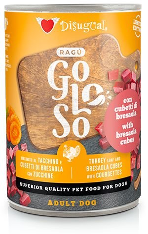 Gurmánské krůtí ragů Disugual s kostky bresaoly a cukety je kompletní krmivo pro dospělé psy všech velikostí s normální úrovní fyzické aktivity. Vyrobeno z 62 % mletého kuřecího masa, zakoupeného od vybraných a garantovaných italských dodavatelů. Vysoké procento mletého masa je obohaceno o 30 %...