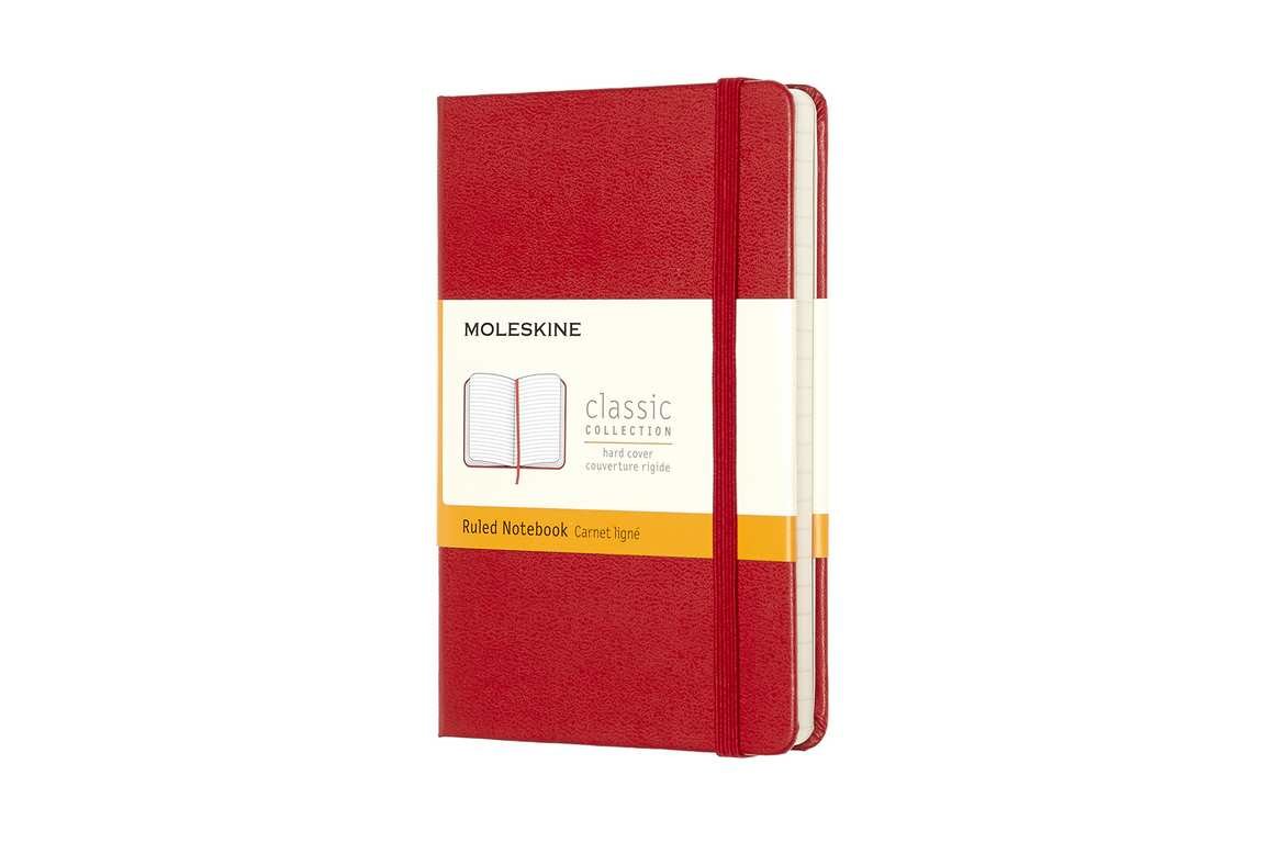 Červený linkovaný zápisník kapesní velikosti. Zápisník má pevnou, ve hřbetu šitou vazbu v kartonových deskách. Obepíná ho pružná páska proti samovolnému otevírání. Každý zápisník je dále vybaven pořadačem poznámek, který je vyroben z tkaniny a kartonu, textilní záložkou a letákem s historií Moleskine. Papír neobsahuje kyseliny.