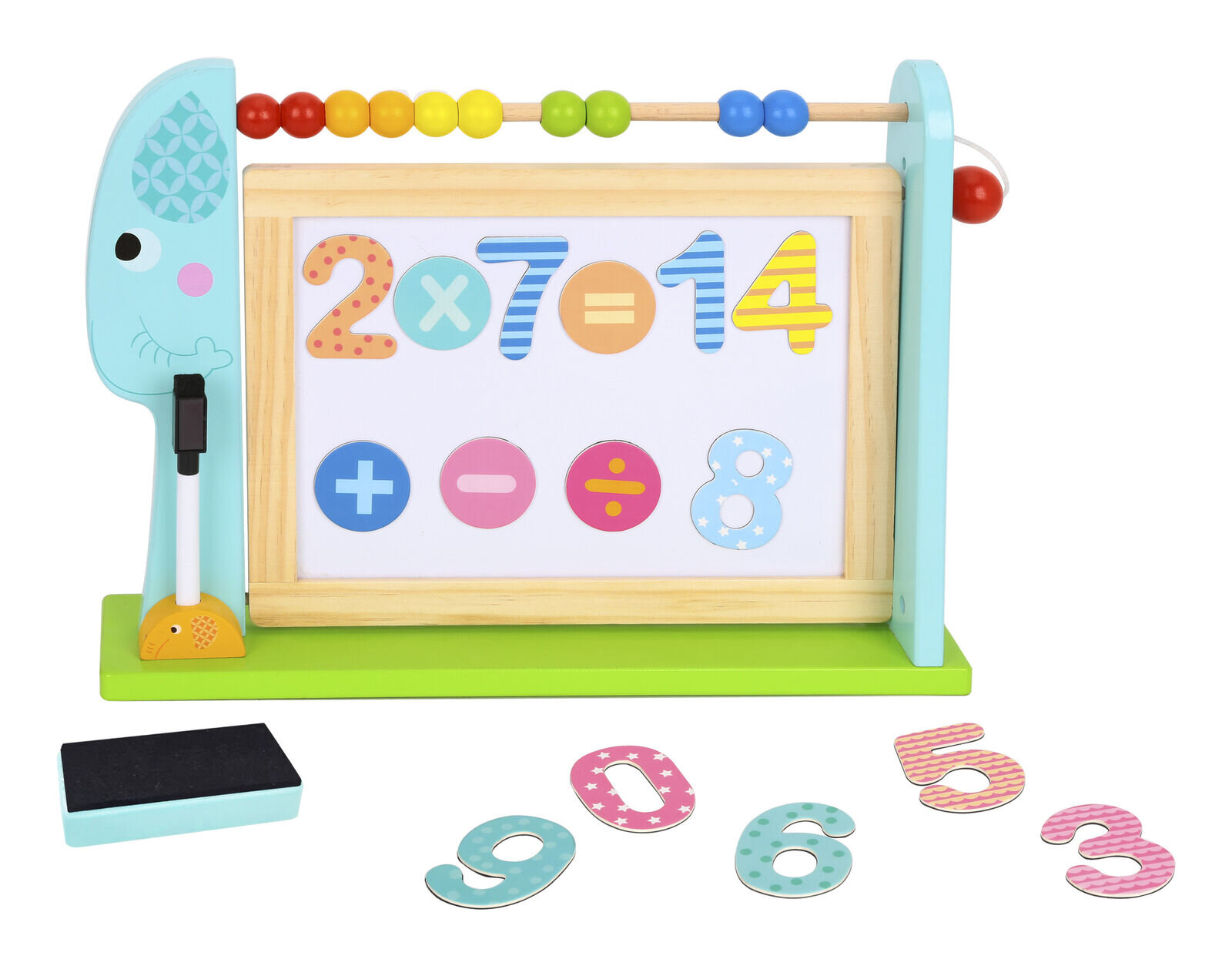 Dieťatko si osvojuje základy matematiky, jemnú motoriku a kreativitu s touto magnetickou tabuľou v tvare sloníka.