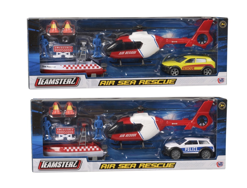 Teamsterz záchraný námořní set obsahující záchranou helikoptéru, člun, automobil, 2 figurky námořníka, varovné cedule a kužely. Výběr z dvou designů. prečítať celé