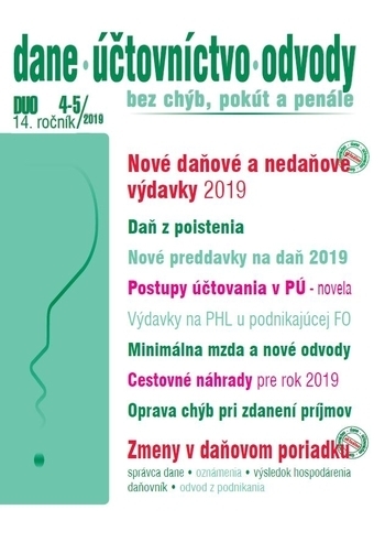 Publikácia obsahuje: Zmeny v daňovej oblasti v roku 2019, Strava v daňových výdavkoch podnikateľa, Príjmy z reklamy oslobodené od dane, Ubytovacie služby a DPH v roku 2019, Preukázanie oslobodenia od DPH pri intrakomunitárnom dodaní, Dodanie a nájom nehnuteľnosti, Postupy účtovania v PÚ - novela,...