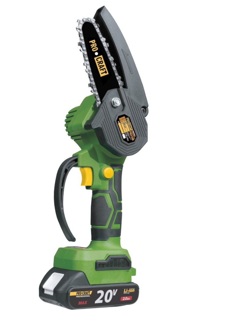 AKU jednoruční řetězová pila je díky svým kompaktním rozměrům užitečným pomocníkem při prořezávání stromů a keřů při práci v omezeném prostoru. Její provoz je v porovnání s většími stroji tichý. Je vybavena ochranou proti zpětnému rázu a bezpečnostním krytem pilového řetězu. Stroj je dodávaný včetně 1 baterie 20V 2Ah, nabíječky, dvou vodících lišt a dvou pilových řetězů v kartonu s montážním klíčem a nádobou na mazací olej.