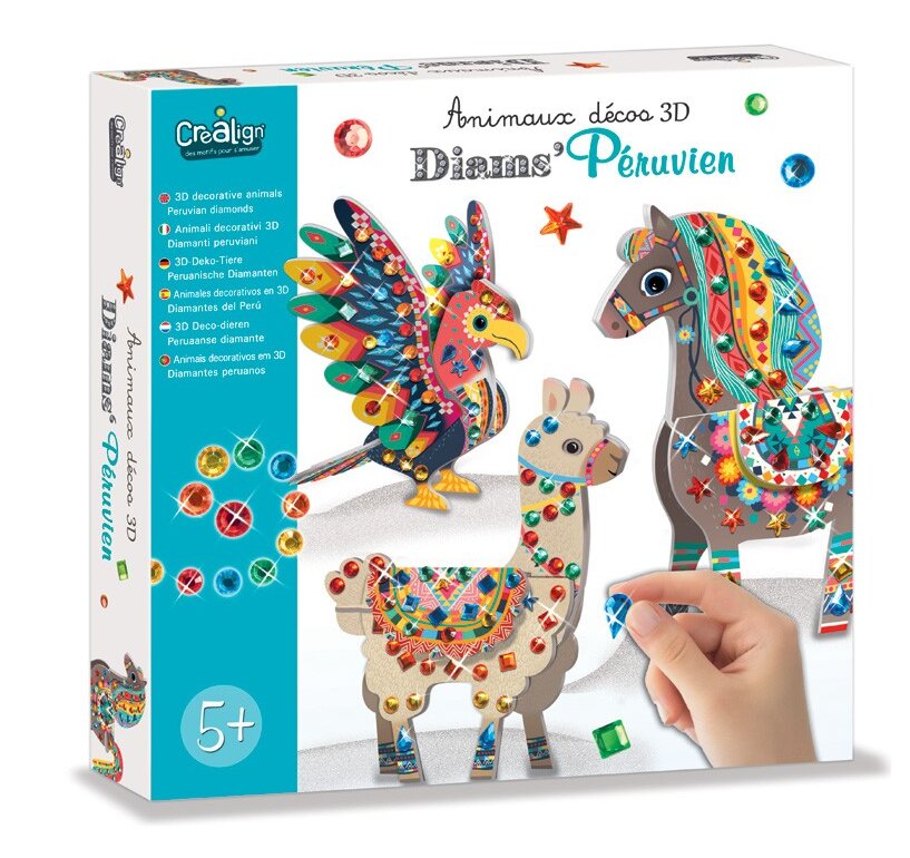 3D zvieratká Diamantová mozaika Zvieratká v Peru 5+Vytvor si trblietavé zvieratká z Peru!Jedinečná kreatívna súprava s diamantovými nálepkami a 3D zvieratkami od francúzskej značky Crea Lign je vhodná pre deti od 5 rokov. Obsahuje 3 zvieratká na zostavenie a 495 diamantových nálepiek. Deti si...