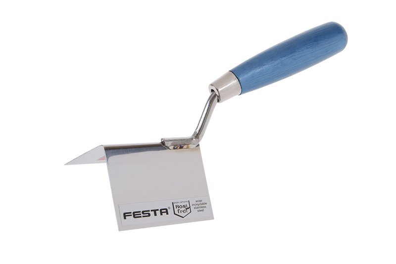 Rohová vyhlazovací nerezová lžíce FESTA 80 x 60 x 60 mm s dřevěnou ručkou. Lžíce rohová (koutová) je vyrobená z kvalitní nerez oceli o tloušťce 1,0mm, držadlo je dřevěné s lakovanou povrchovou úpravou. Vymazávačka se používá k úpravě a začištění jak vnějších, tak vnitřních rohů.