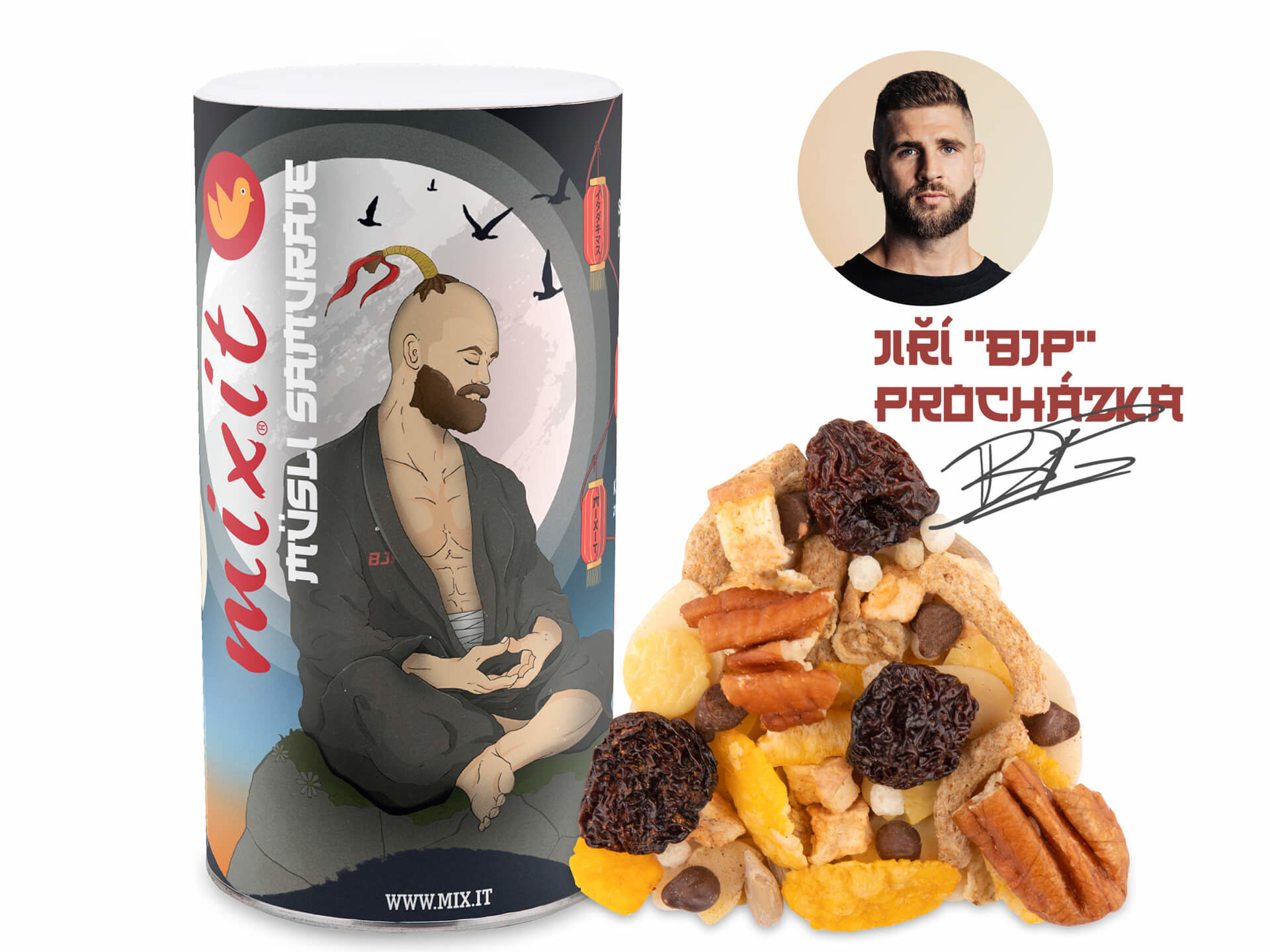Musli edice nejlepšího českého zápasníka Jirky Procházky. Jirka tentokrát vítězí s recepturou müsli, která nešetří na ovoci, oříškách a čokoládě. Každá svačina a snídaně má být také odměnou za odvedenou práci a povzbuzení do nového dne, müsli samuraje vás odmění mandlemi, višněmi, pekanovými...
