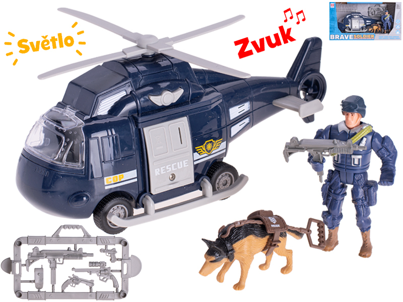 Policie vrtulník 22cm na setrvačník na baterie se světlem a zvukem s doplňky v krabičce