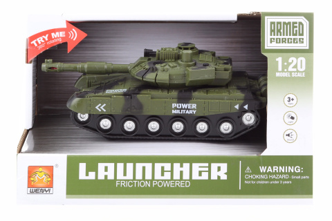 Plastový tank o rozměru cca 17 x 7,5 x 8 cm na baterie. Napájení 3x AG13/LR44 baterie které jsou součástí. Tank po stisknutí knoflíku svítí a vydává zvuky. Rozměr balení cca 24 x 11 x 15,5 cm. Věk 3+ prečítať celé