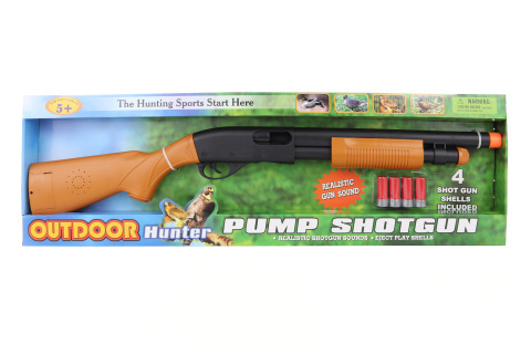 Plastová brokovnice na baterie. Pistole vydává reálné zvuky střelby a nabíjení. Plastové náboje lze vložit do zásobníku, po zmáčknutí spouště vypadnou ven. Napájení na 2 AA baterie (nejsou součástí balení). Rozměr brokovnice cca 76 x 8 cm. Rozměr balení cca 78,5 x 24,5 x 5 cm. Věk 5+