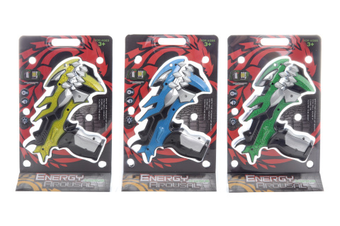 Plastová pistole na baterie. Vydává zvuky, svítí a po zmáčknutí spouště otevře tlamu. Napájení na 2 AA baterie (nejsou součástí balení). Rozměr pistole cca 22 x 15. Rozměry balení cca 31,5 x 21 x 7,5 cm. Věk 3+ prečítať celé