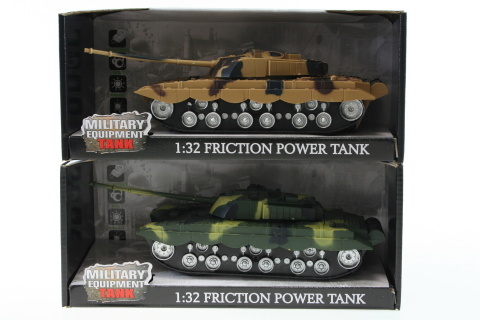 Plastový tank v krabičce. Napájení na 3x baterie AF13 (jsou součástí balení). Tank je na setrvačník a má pohyblivé dělo. Po stisknutí tlačítka vydává zvuky s svítí. Rozměry tanku cca 27 x 10 cm. Rozměry balení cca 29 x 13 x 12,5 cm. prečítať celé