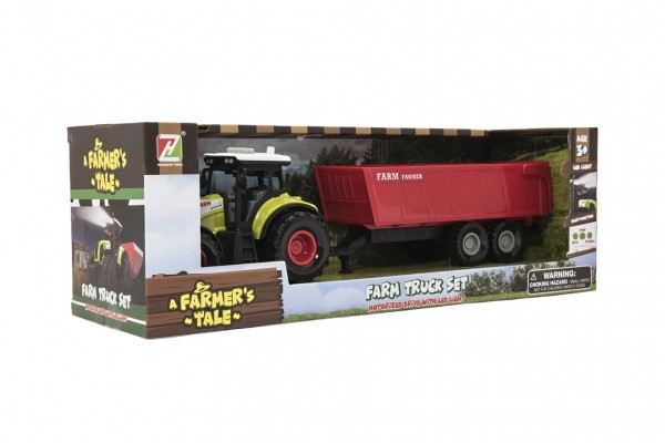 Traktor s vlekem plast 35cm na setrvačník na baterie se zvukem se světlem v krabici 39x13x13cm