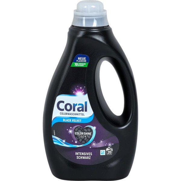 Coral Black Velvet - prací gel na černé prádlo - 20PD - 1lS tekutým pracím prostředkem Coral zůstane vaše oblíbené černé oblečení déle jako nové. Černá často po pár praních vybledne a barva vypadá rychle sepraná. S pracím prostředkem Black Velvet color od Coral zůstane barva vašeho tmavého...