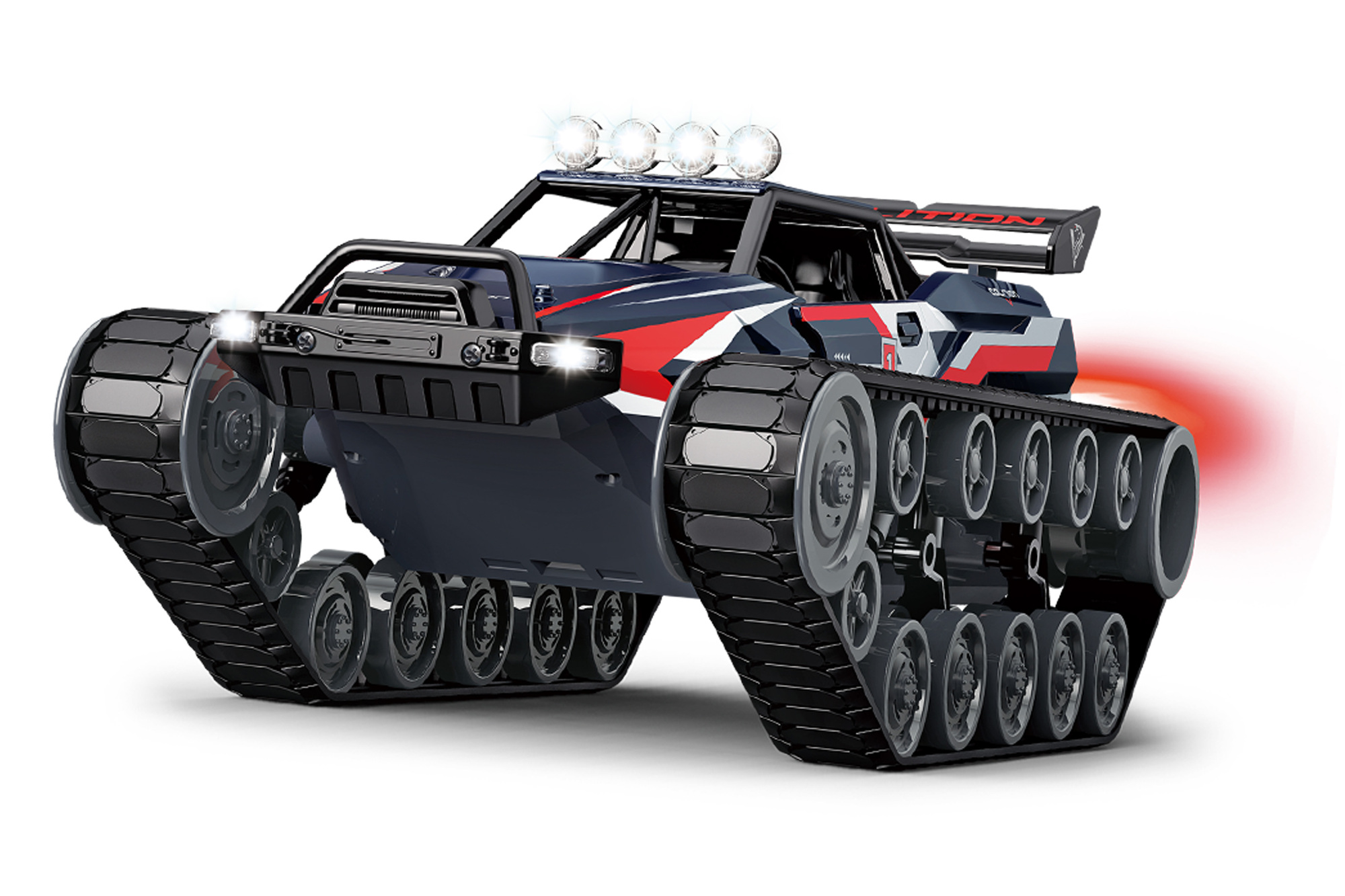Tento štvorpásový model s pištoľovým ovládačom funguje na frekvencii 2,4 GHz, čo zabezpečuje stabilnú a rýchlu odozvu ovládania až do vzdialenosti 50 metrov. Vďaka schopnosti zdolať stúpanie do 30 stupňov sa vozidlo nezľakne ani náročnejšieho terénu. Okrem toho je vybavené prednými, zadnými aj strešnými svetlami, ktoré spolu s dymovými efektmi dotvárajú atmosféru akčnej jazdy. Batéria s napätím 7,4 V je súčasťou balenia, ovládač napájajú 3 batérie AA, ktoré nie sú zahrnuté. Súčasťou balenia je aj USB kábel pre jednoduché nabíjanie a nádobka na vodu potrebná pre dymový efekt.