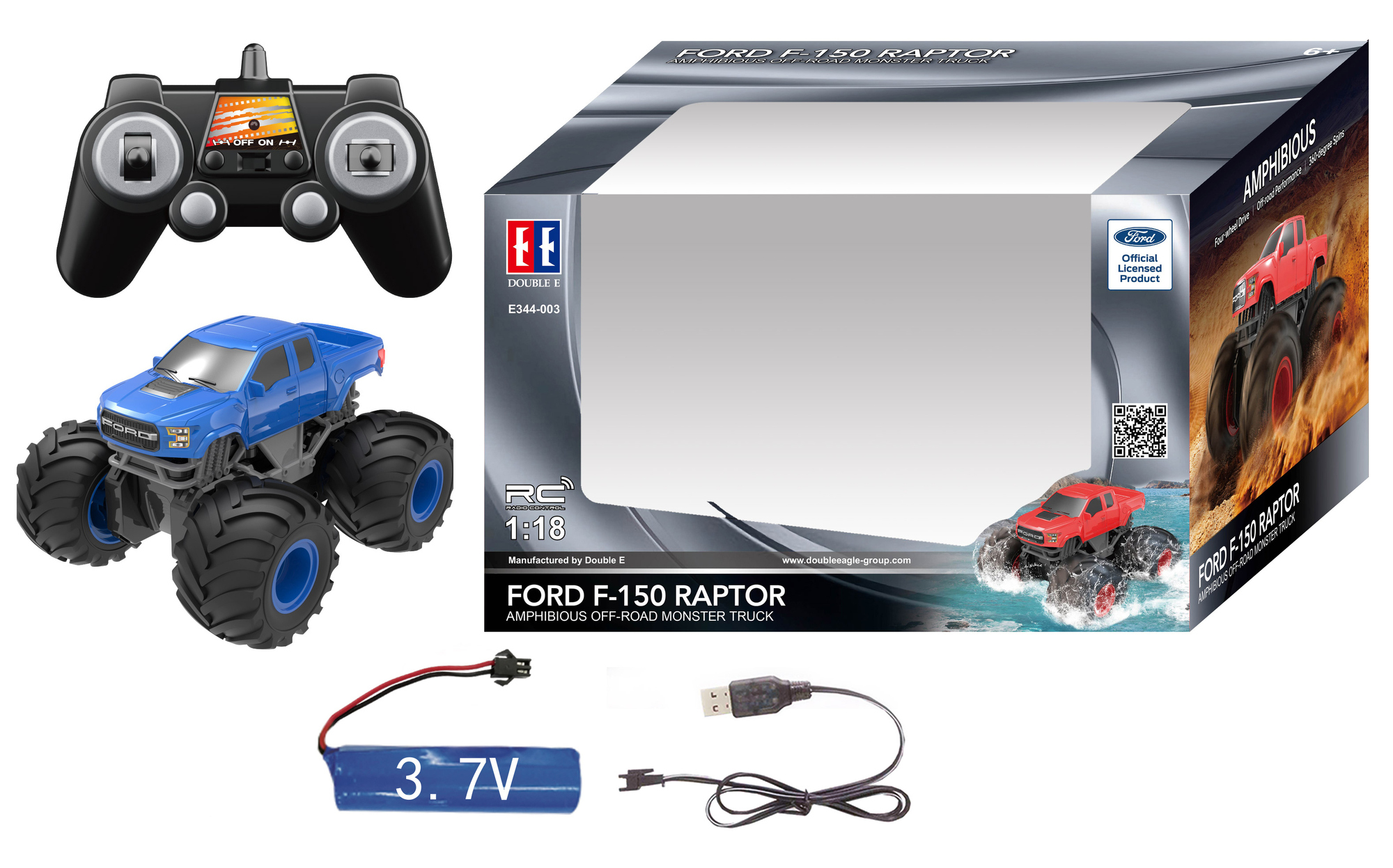 Ford F-150 Raptor Monster Truck plavací modrý RC na dálkové ovládání. Rozměry 20,2x17,2x13,2 cm. Frekvence 2.4GHz. Bateriový pack 3.7V 500mAh do auta součástí, 2xAA do ovladače nejsou součástí. Tlačítko (přepínač) ON/OFF na spodní straně auta. Ovladač - pohyb dopředu a dozadu, otáčení vlevo a vpravo, přepínač ON/OFF, 2 tlačítka pro trimování kol. Doba nabíjení 3 h.