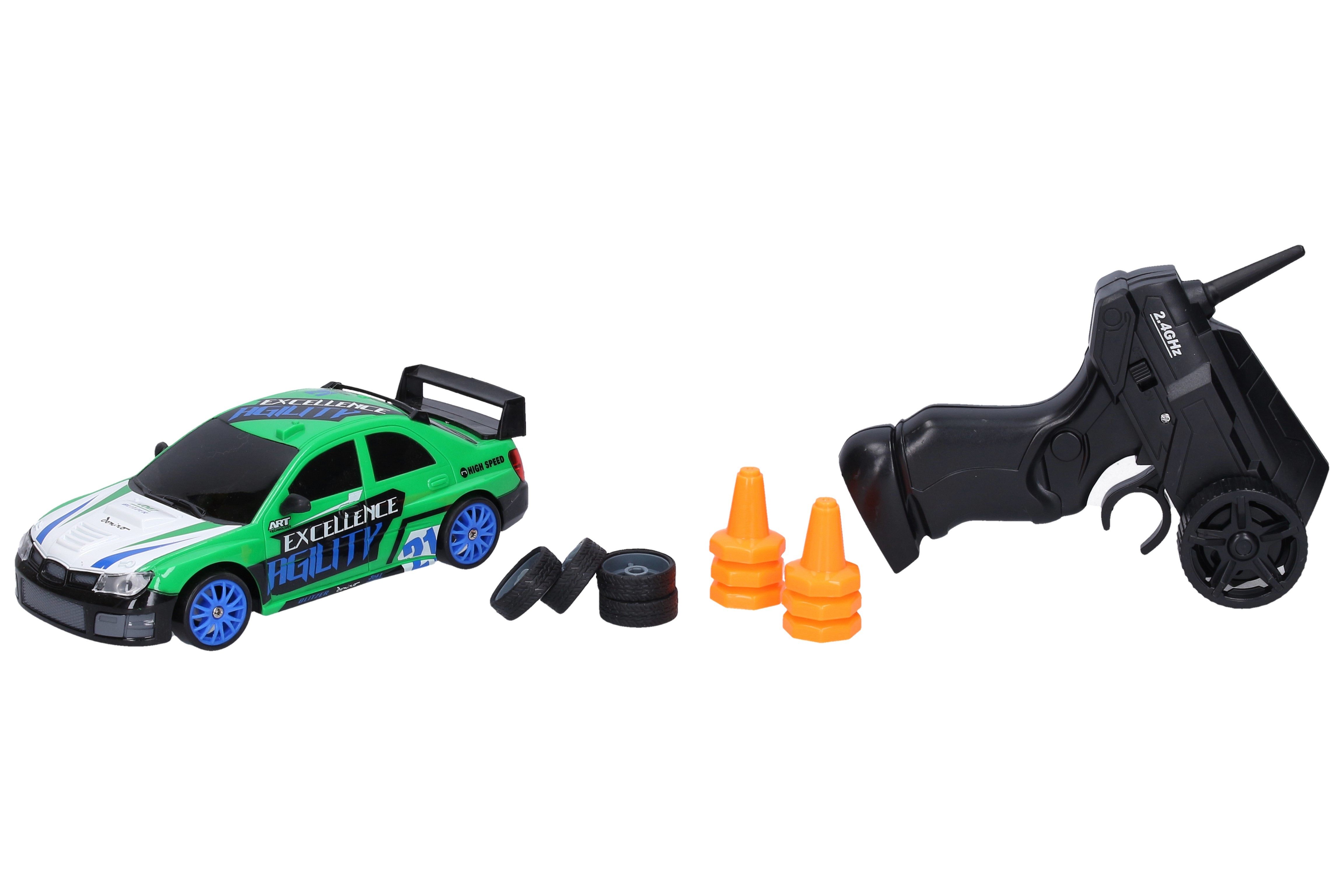 Auto závodní drift RC 2 sady kol. Rozměry 18,5 x 8 x 6 cm. Balení obsahuje auto, ovladač, 6 kuželů, 2 sady kol (hladké, gumové pneu). Gumové pneu zvyšují přilnavost a umožňují rychlejší jízdu. Frekvence 2,4 GHz. Světelné efekty. Pohon 4x4. USB nabíjecí kabel v balení. Bateriový pack pro auto součástí, 2xAA baterie pro ovladač nejsou součástí.