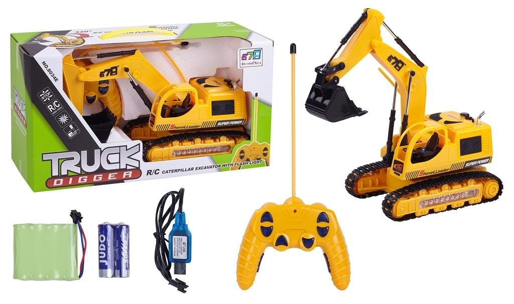 Koparka na gąsienicach z ruchomym ramieniem z łatwością nabiera ładunek. Ruchoma platforma podświetlana gąsienica światło w kabinie. Pełne sterowanie łatwym w obsłudze pilotem sprawia, że koparka jeździ do przodu, do tyłu i skręca, zgodnie z życzeniem swojego operatora. Zasilanie: koparka 4.8 V + ładowarka USB w zestawie, pilot, 2 x AA.