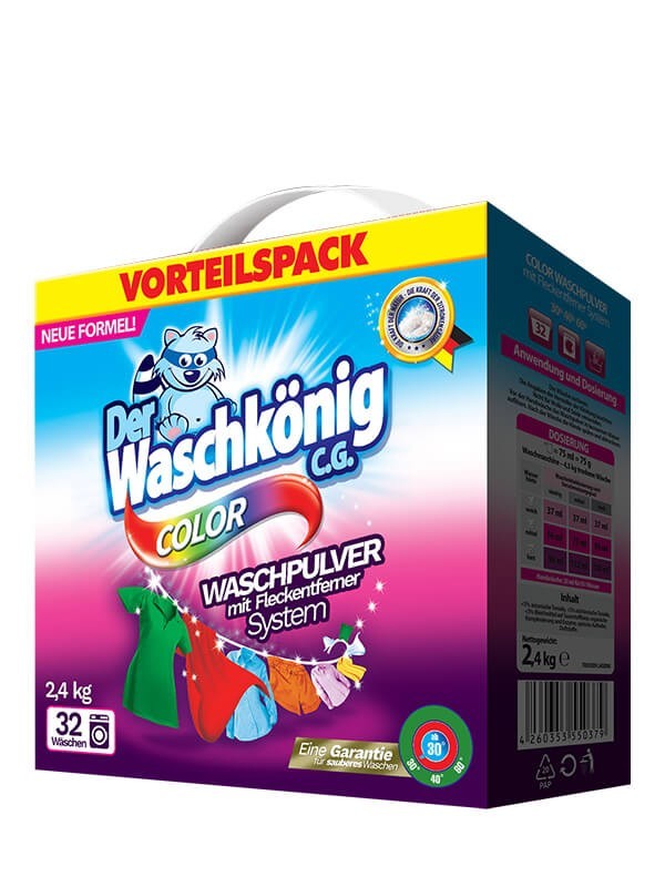 Waschkönig Color je prací prášek určený pro praní barevného prádla s výbornými pracími výsledky především v odstraňování skvrn a obnovy původní barvy. Koncentrát. Teplotní prací rozsah: 30, 40, 60, 95 oC Intenzivní a svěží vůně Obnova barev Odstranění skvrn Ochraňuje pračku před usazováním...