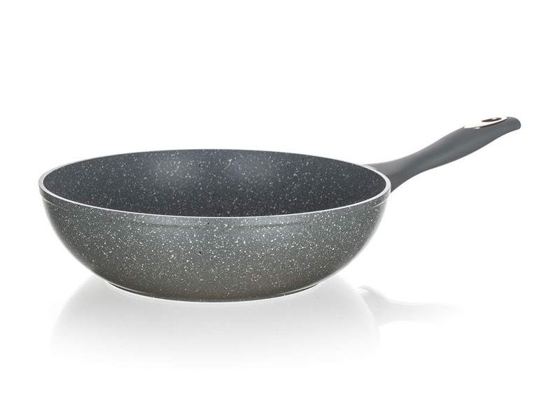 Hliníková litá kovaná pánev WOK GRANITE GREY 28 x 7,8 cm s nepřílnavým povrchem, šedý granitový dekor, tloušťka stěny 3 mm, soft-touch rukojeť. Nepřilnavý povrch je velmi tvrdý a odolný proti poškrábání. Vysoká tepelná vodivost zajišťuje rychlé a ekonomické vaření - dlouho drží teplotu....