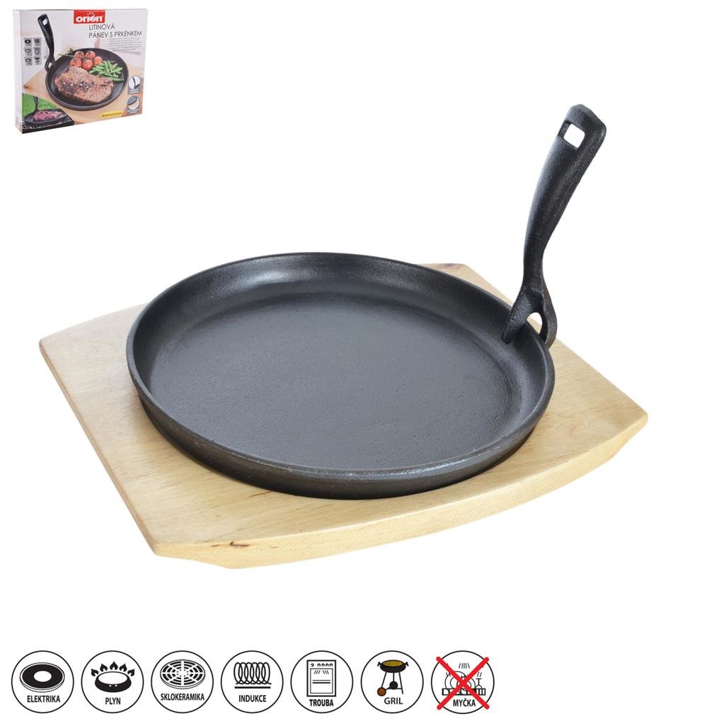 Pánev z litiny Vám pomůže při přípravě chutných pokrmů z masa, zeleniny, brambor. Pánev s hotovým pokrmem umístíte na prkénko a rovnou na ni jídlo servírujete. Ozvláštníte tak běžné stolování a podávání pokrmů. Materiál: litina. Doporučujeme používání kuchyňské chňapky. Můžete připravovat pokrmy...